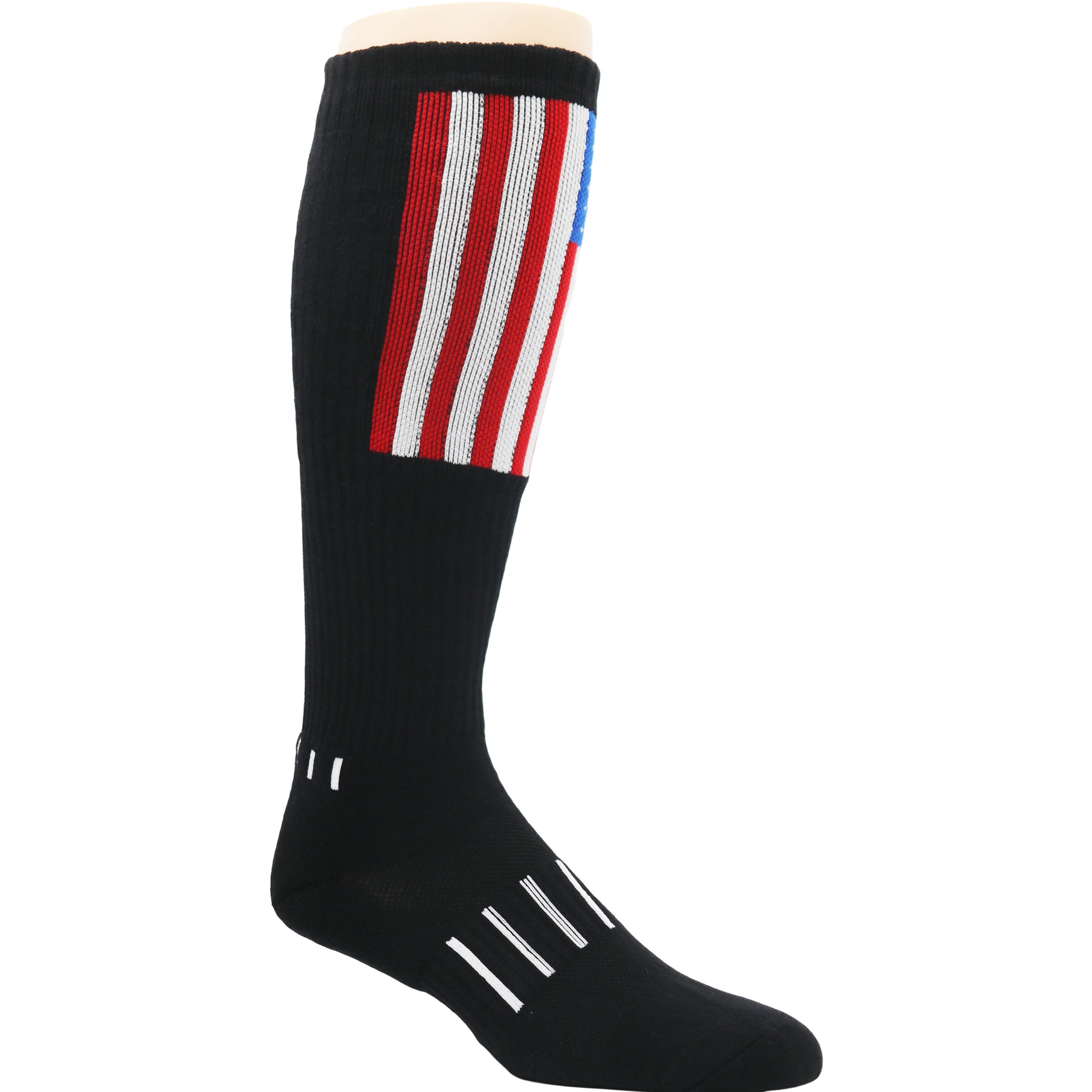 The Deadlift BLOCK!!! We allowed for an imprint area on the front of the sock and printed an American Flag on the front of the socks… showing you where the protection comes in! These impressive Black Knee-Highs come fully equipped with protection in mind. Featuring heavy cushion in the pattern area, these specialty performance deadlift socks help you come equipped for your best workouts. Protecting the shins and upper leg, these knee-highs will also breathe well down below with our original Moxy Performance Foot. Perfect for exercise, fitness, powerlifting, deadlifting, motocross, hardcore sports, skiing, soccer, softball, and lacrosse. Black with Red White and Blue, Unisex Adult Size.