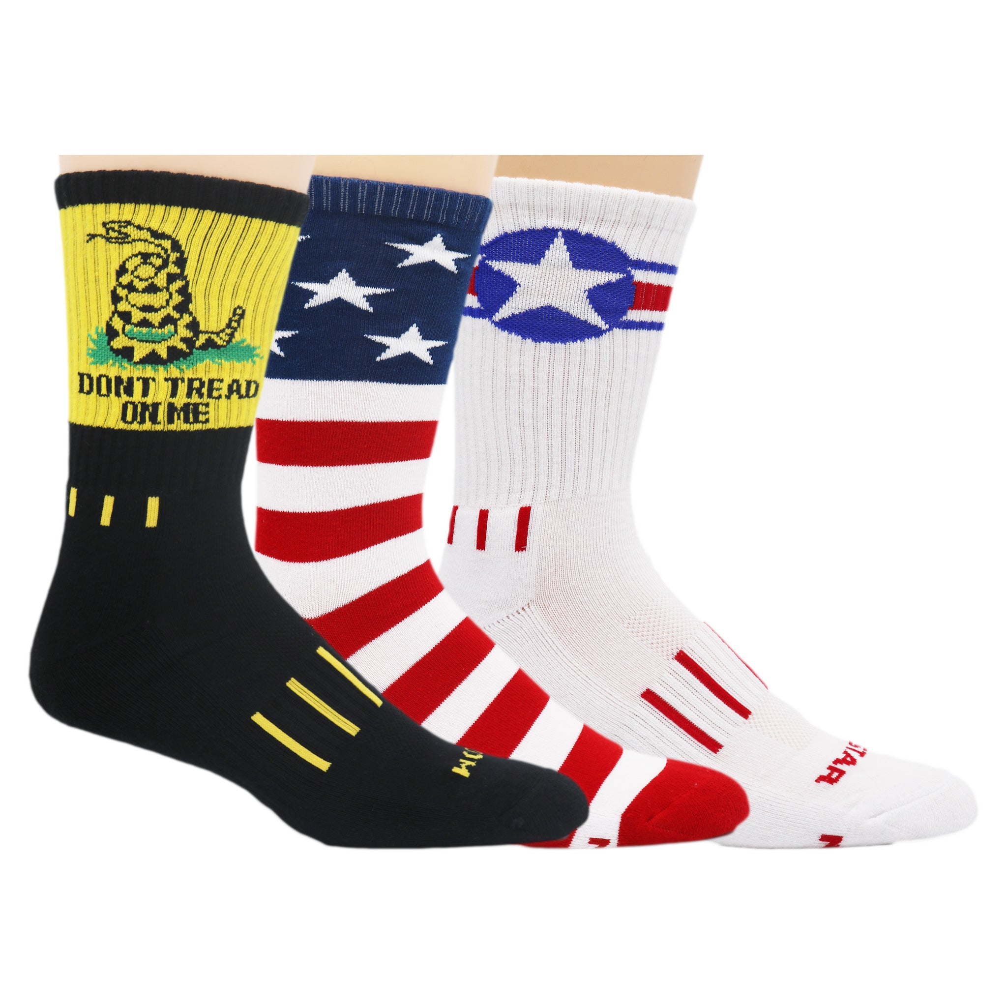 Become an American Patriot today!!! This Moxy Socks 3-Pack is sure to wow and awe-strike anyone in your life, featuring 3 Majorly patriotic American Freedom socks!!! We have the “Don’t Tread on Me” socks capturing the Gadsden Flag popping out on a Black knee sock, followed by the American Flag Stars and Stripes knee, and lastly with the white American Star knee sock, an homage to the patriots who flew planes in World War 2. Of course, our MADE IN USA socks come with all the enhanced performance features, but in this pack, you will save extra money! Multi-Colored Pack, One Size Fits All Unisex.