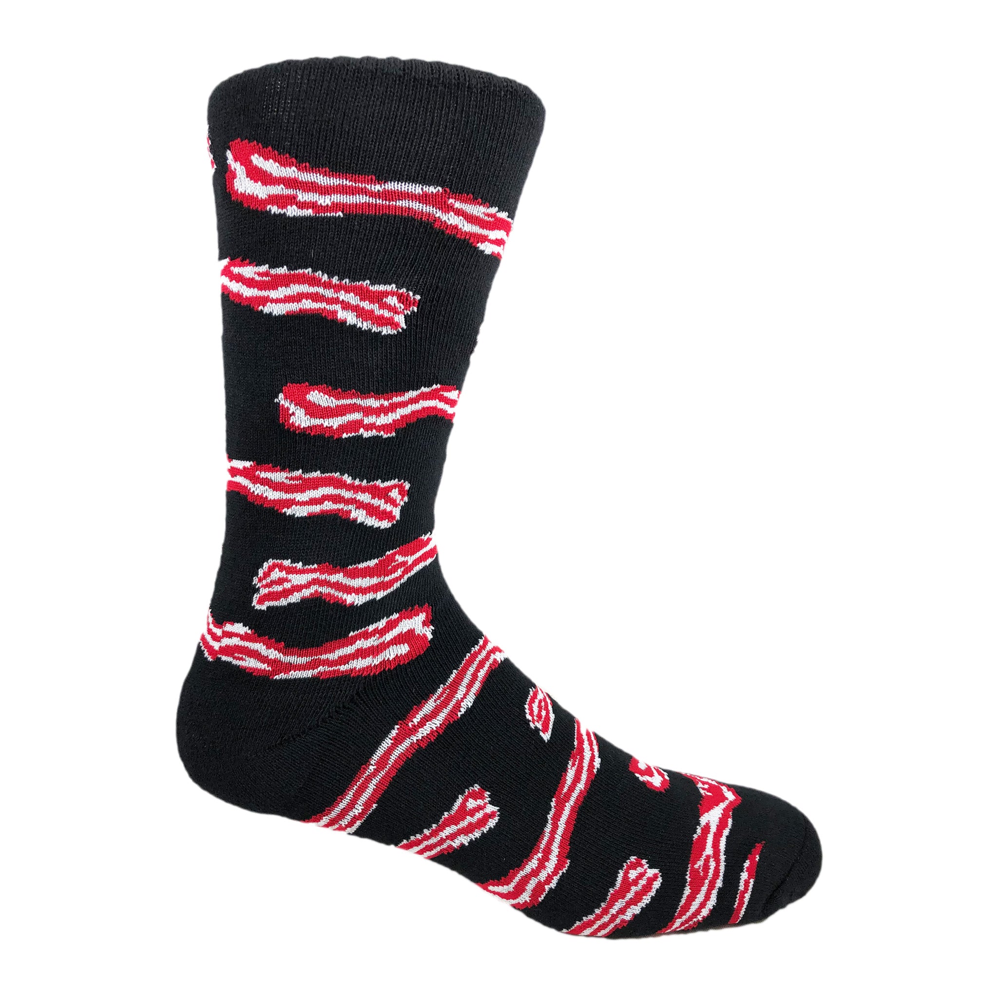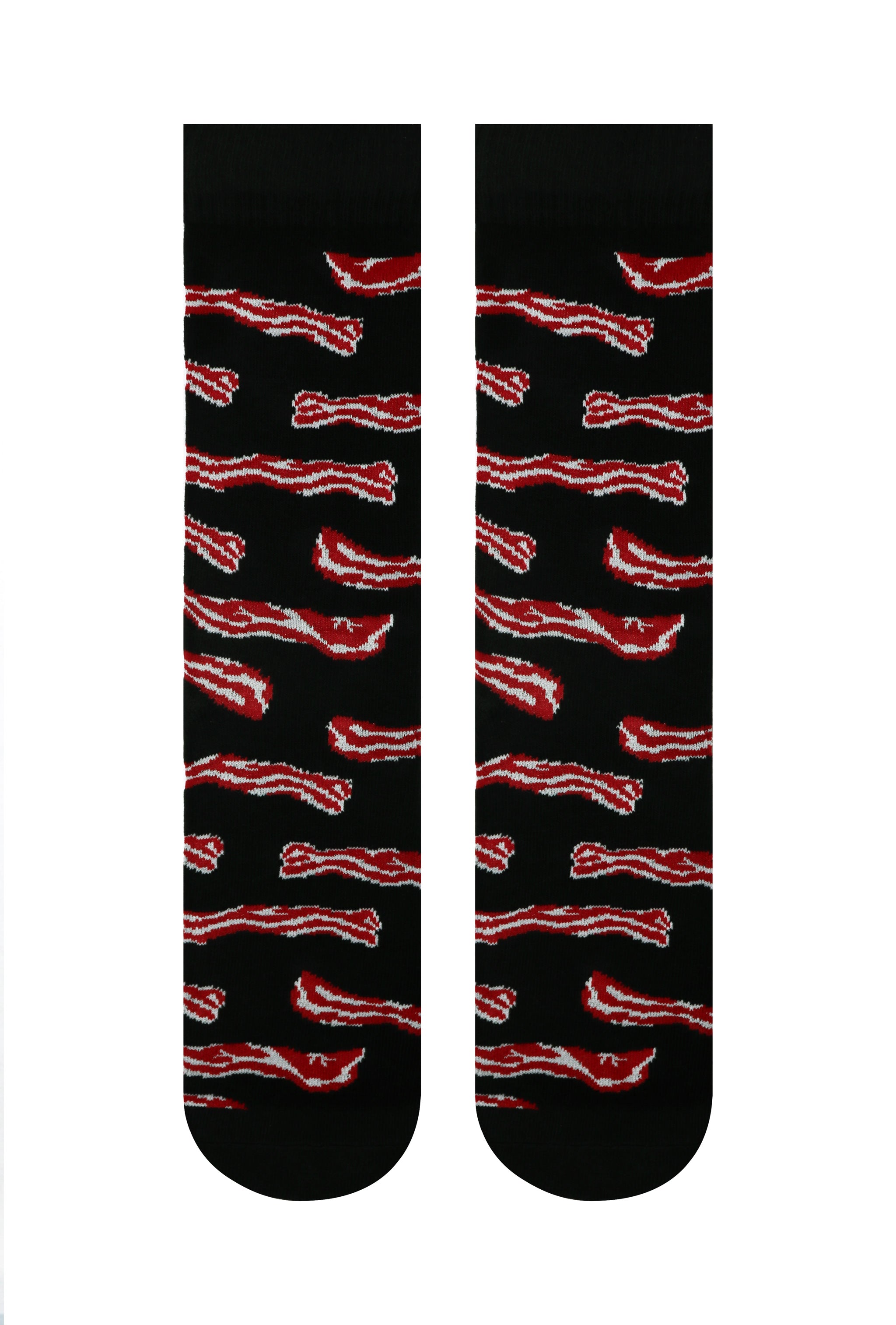 Bacon, Bacon, BACON! At Moxy Socks, we have the meats!!! These bacon crew socks sizzle with the smell of breakfast bacon all over our premium black crew socks. These socks are Made in the USA and will feel satisfy like a mountain of bacon. Unisex adult size, Black with Red.