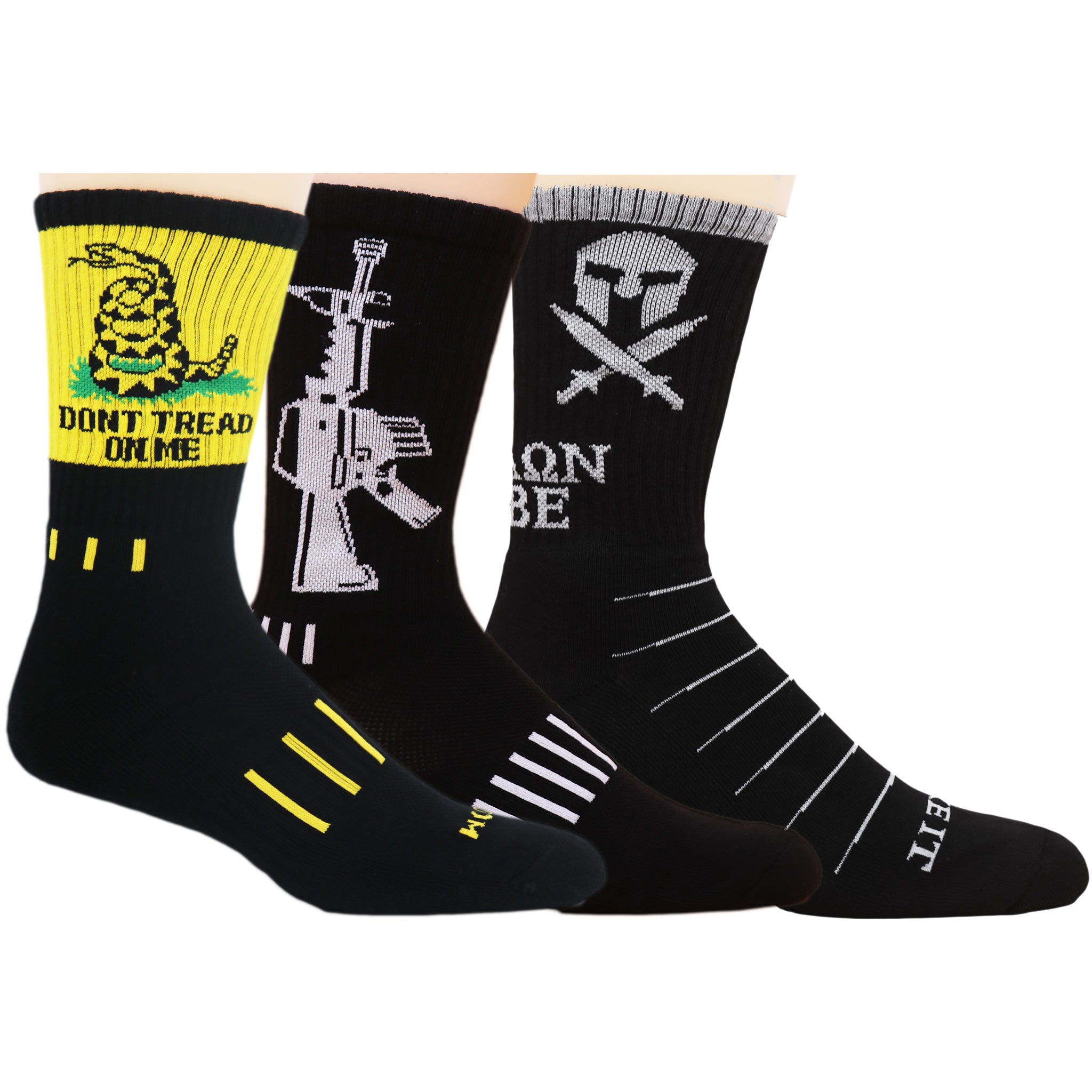 The Come and Take it Pack 3-Pack! These socks are tough Americana-inspired strong pieces of durable premium black crew socks! Starting with the Molon Labe Black crew, featuring a Spartan head and the iconic Molon Labe lettering. We then have the Assault Rifle crew that sports an AR-15 down. Lastly, we have one of our best-sellers, the 'Don't Tread on Me' Crew socks bolstering the iconic yellow snake of the historical Gadsden Flag! These are an American Patriot's biggest dream and a perfect gift. 3 Pack, Black. Unisex Adult Size.