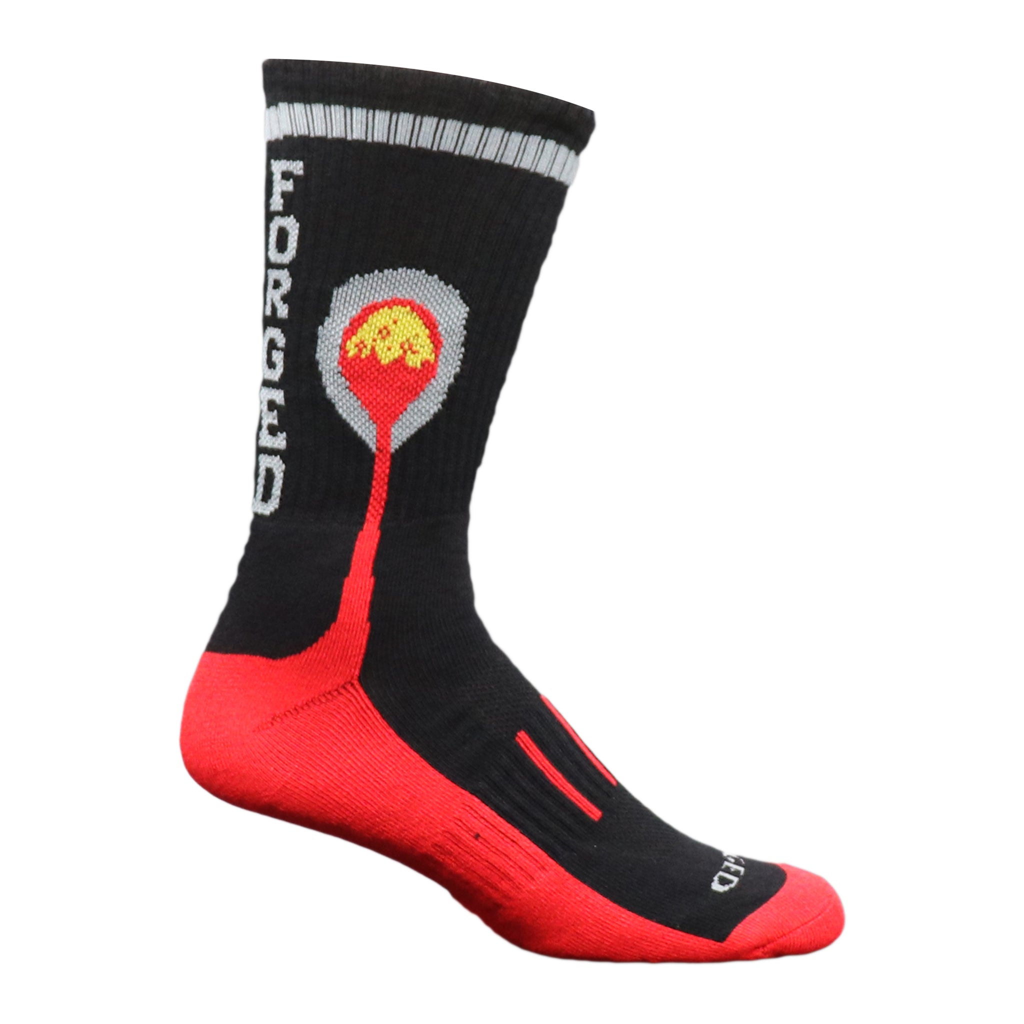 FOUNDRY FORGED!!! Check out these kick ass Forged crews! A Steel pouring bucket dripping hot magma lava into the bottom of the foot, held by chains of pure, raw strength and steel!! These socks represents strength, endurance, and pure unadulterated raw quality! Complete with the Moxy Performance foot, and all the standard performance features, these socks will be a hit at the gym, a spartan race, a mudrun, or probably anywhere you go!