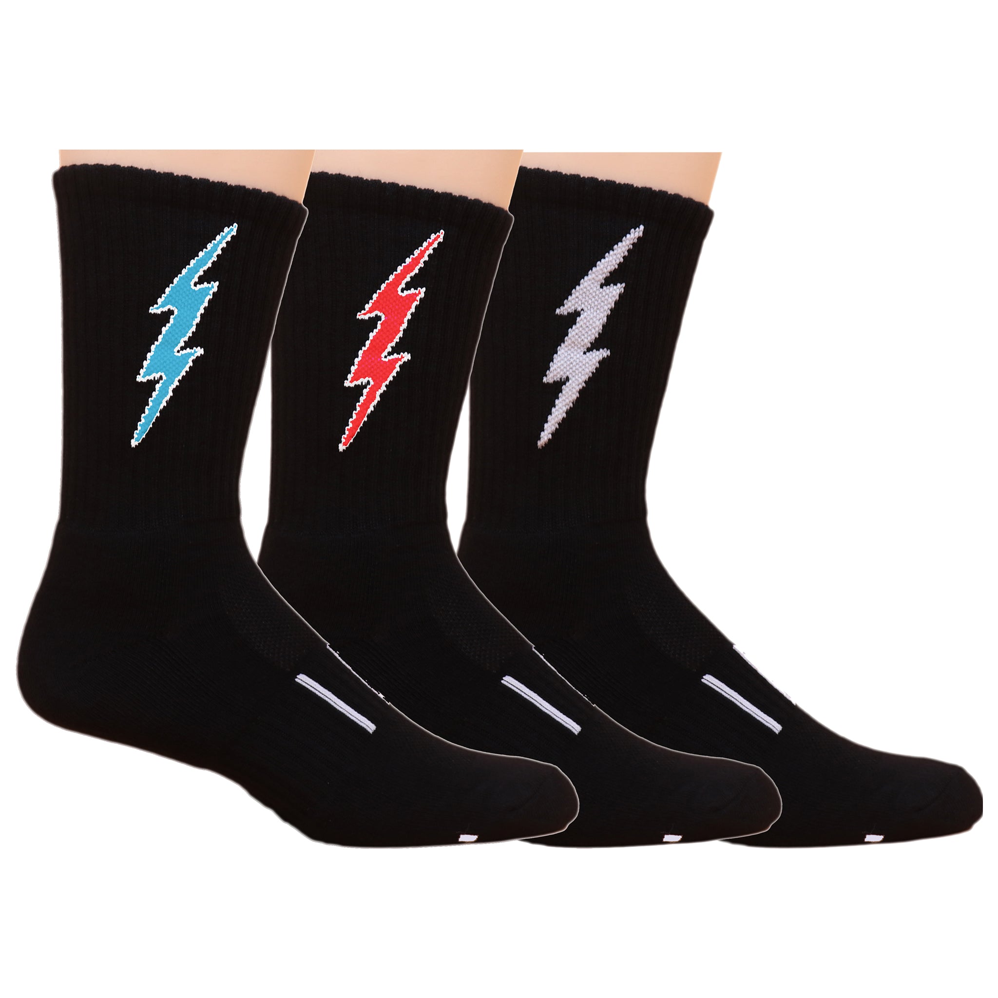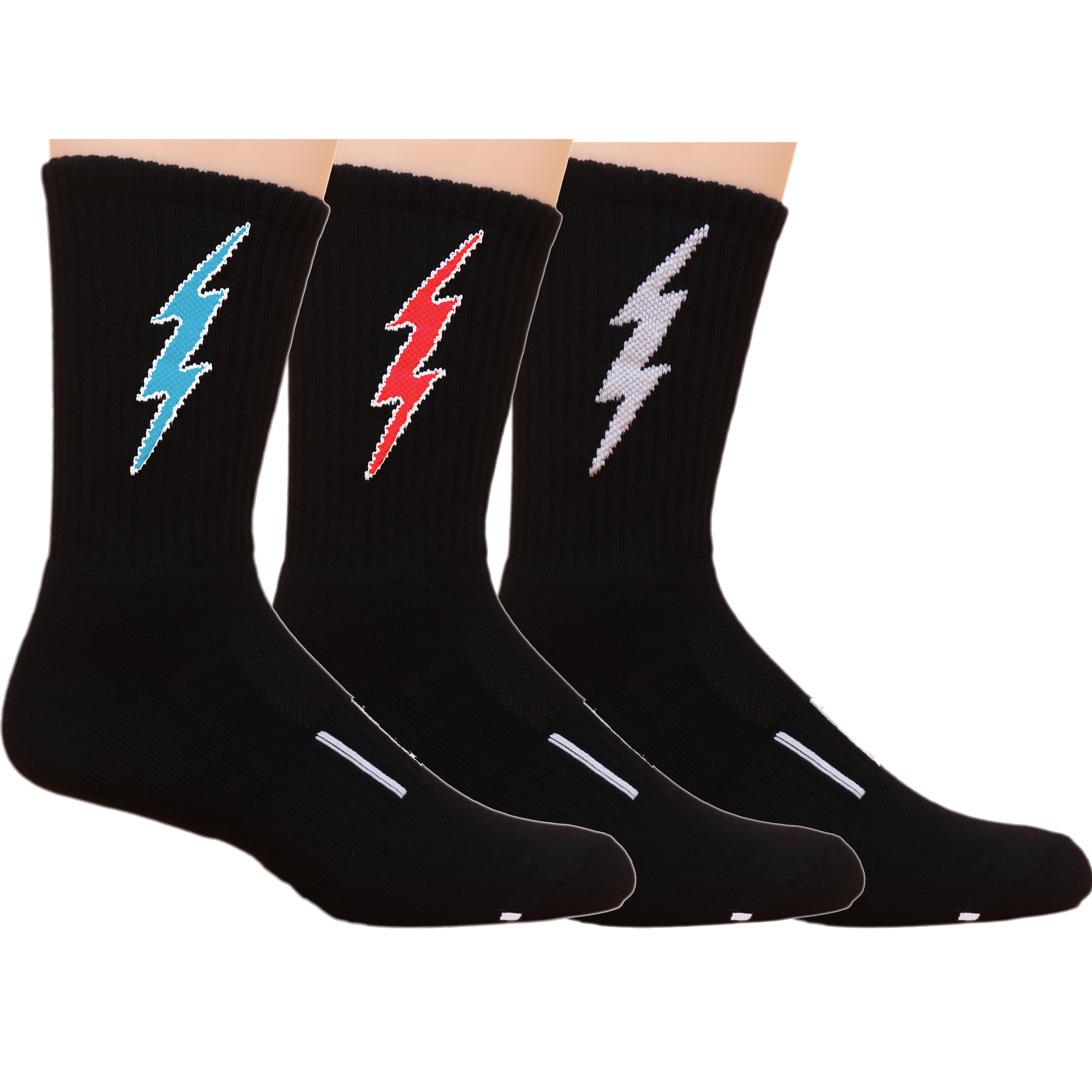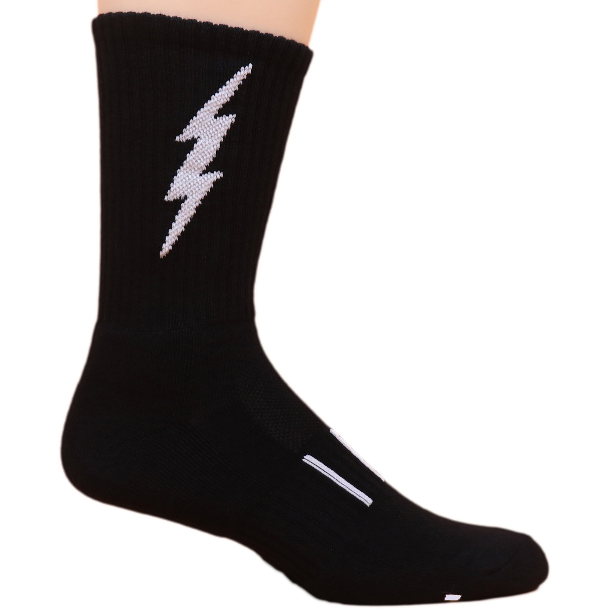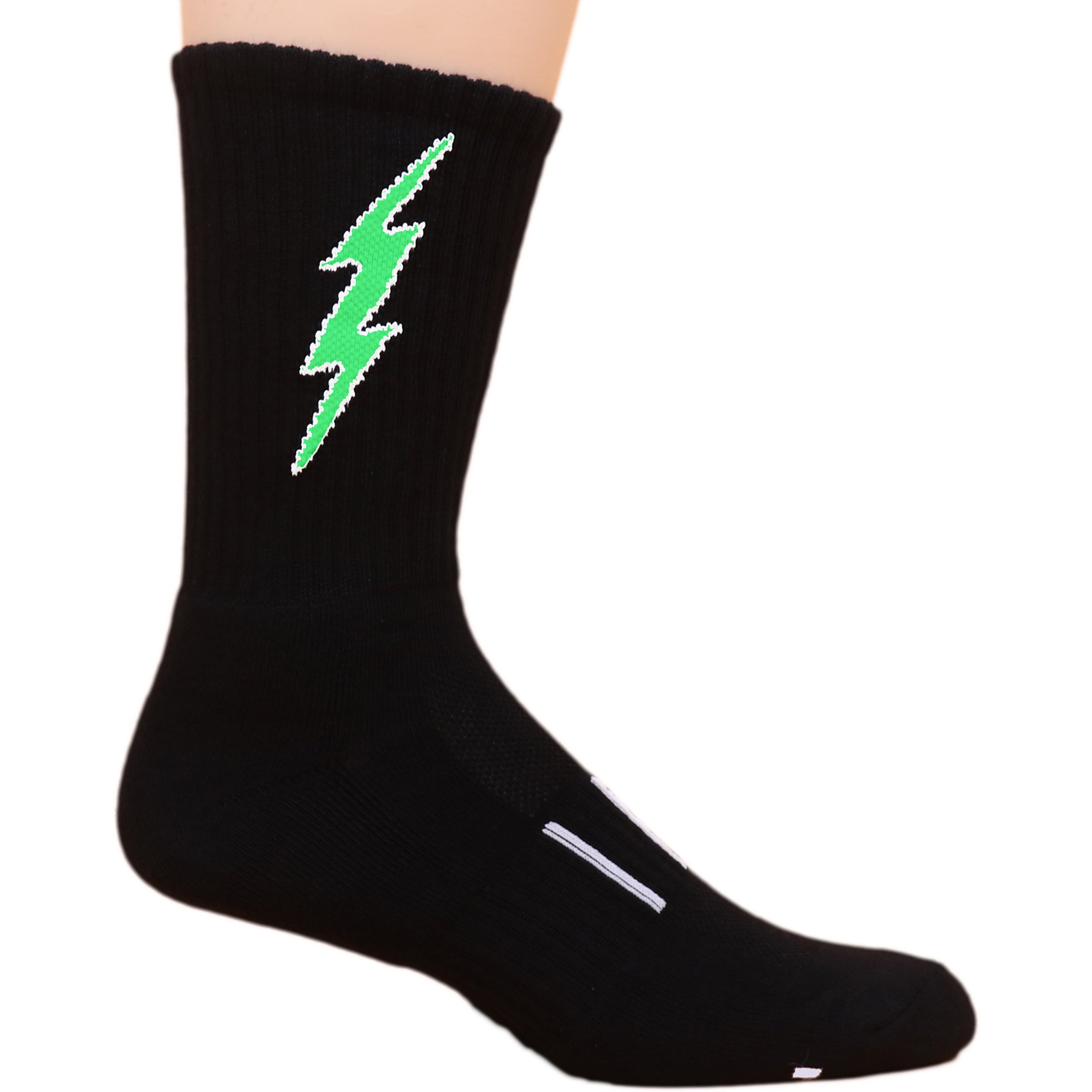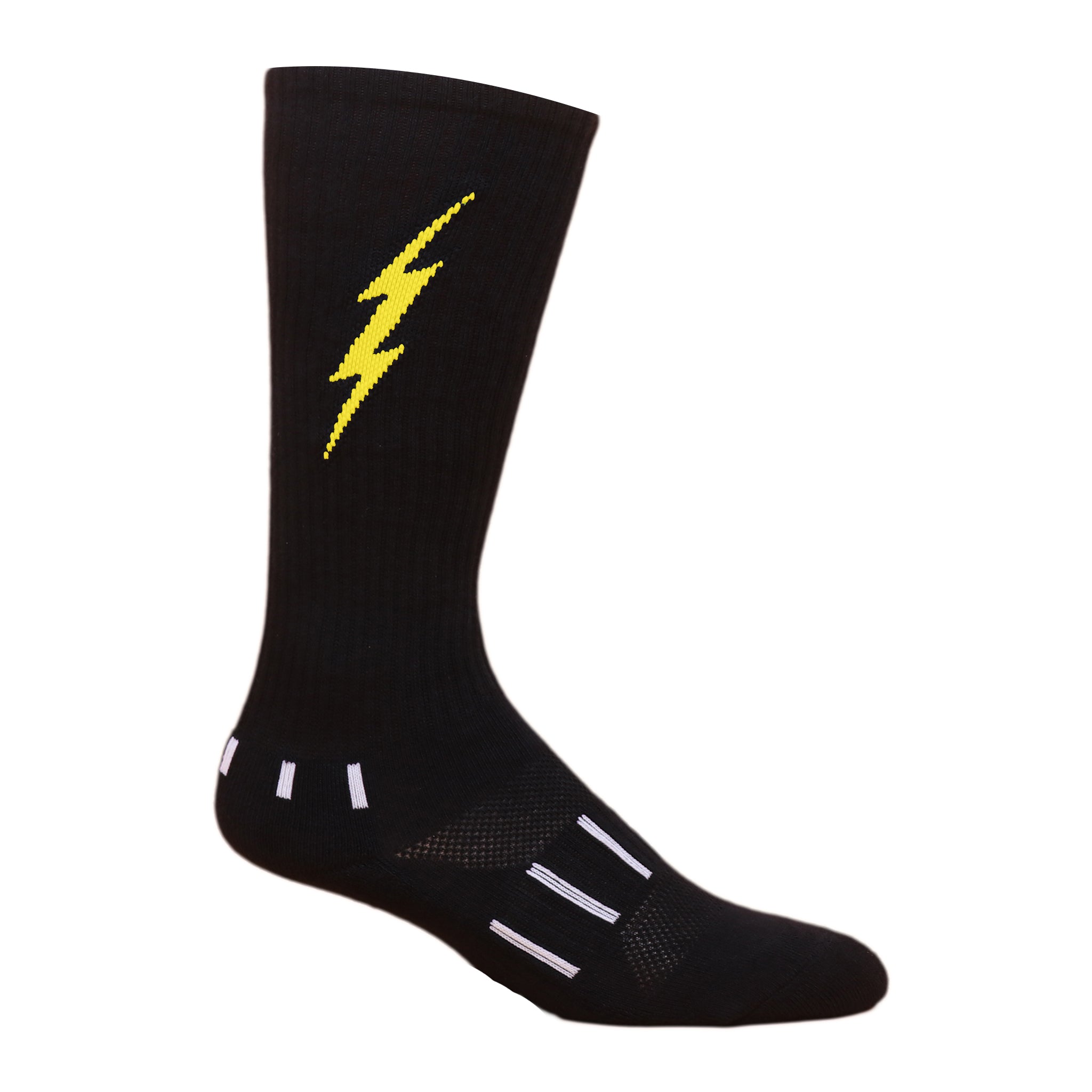 These socks are Electric! With a solid black outline, embellished with a blue lightning bolt FLASH, these MOXY Socks show gusto. Made specifically for Jump Ropes, Rope Climbs, Box Jumps, and Deadlifts, these socks will look good while you conquer the gym in unique style. Made In the USA with platinum durability, arch support, and performance enhancing support. Perfect for everyday life!