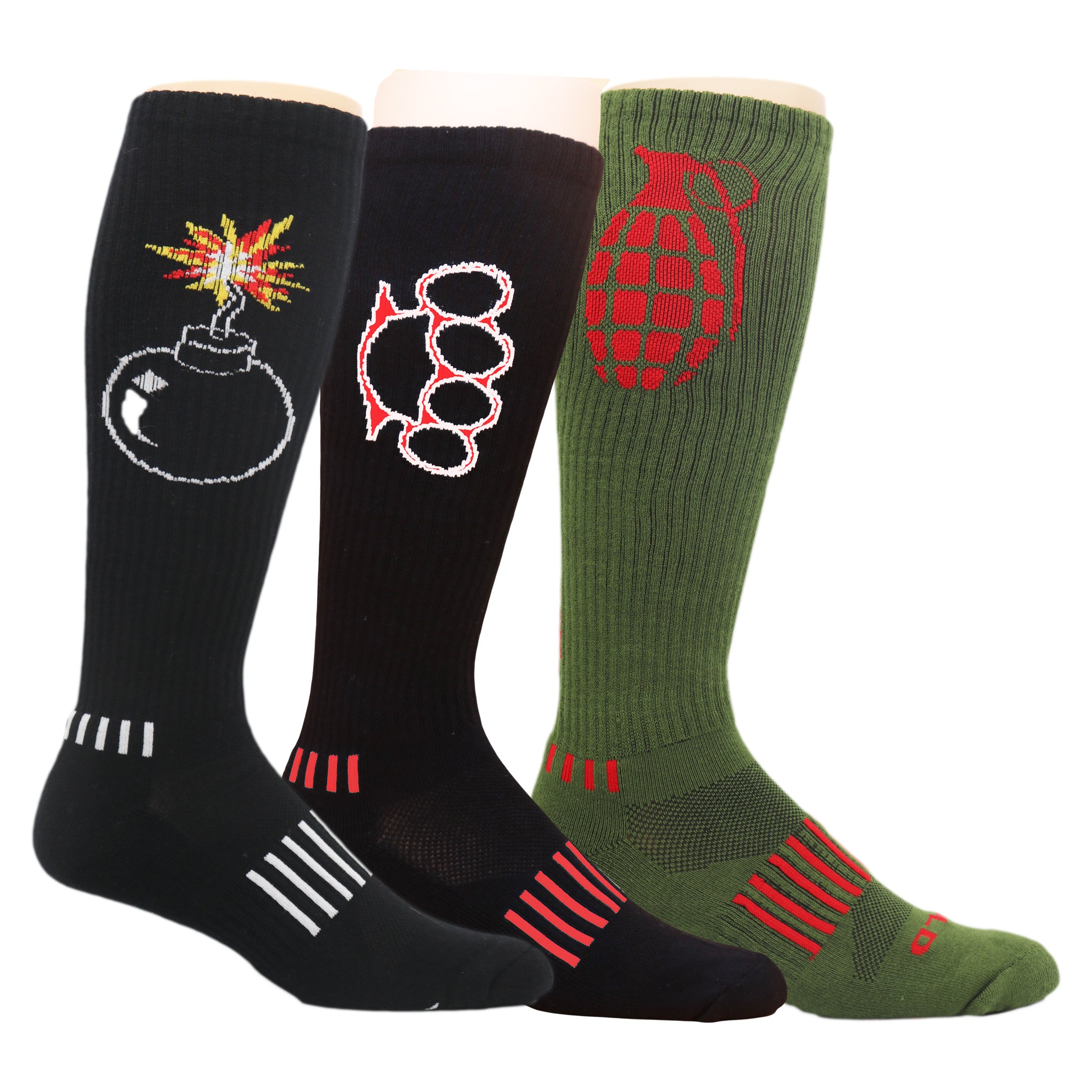 Introducing the 3-Pack Artillery Pack Premium Fitness Knee-High Socks, the perfect solution for all your fitness needs. Made from a premium blend of cotton, polyester and spandex, these socks provide maximum comfort and performance during any workout. The snug yet flexible fit hugs your calves to prevent slipping and bunching, while the breathable fabric wicks moisture to keep your feet cool and dry. Strategically placed arch compression offers superior support and relief from foot fatigue, allowing you to power through even the toughest training sessions. Whether you're crushing a HIIT class, running a marathon or tackling a grueling leg day, the anti-odor technology helps reduce unwanted smells so your socks stay fresh. The reinforced heel and toe provide enhanced durability in high wear areas, while the vibrant colors and patterns add stylish flair to your gym outfit. Take your fitness to the next level in comfort and style with the 3-Pack Artillery Pack Premium Fitness Knee-High Socks.