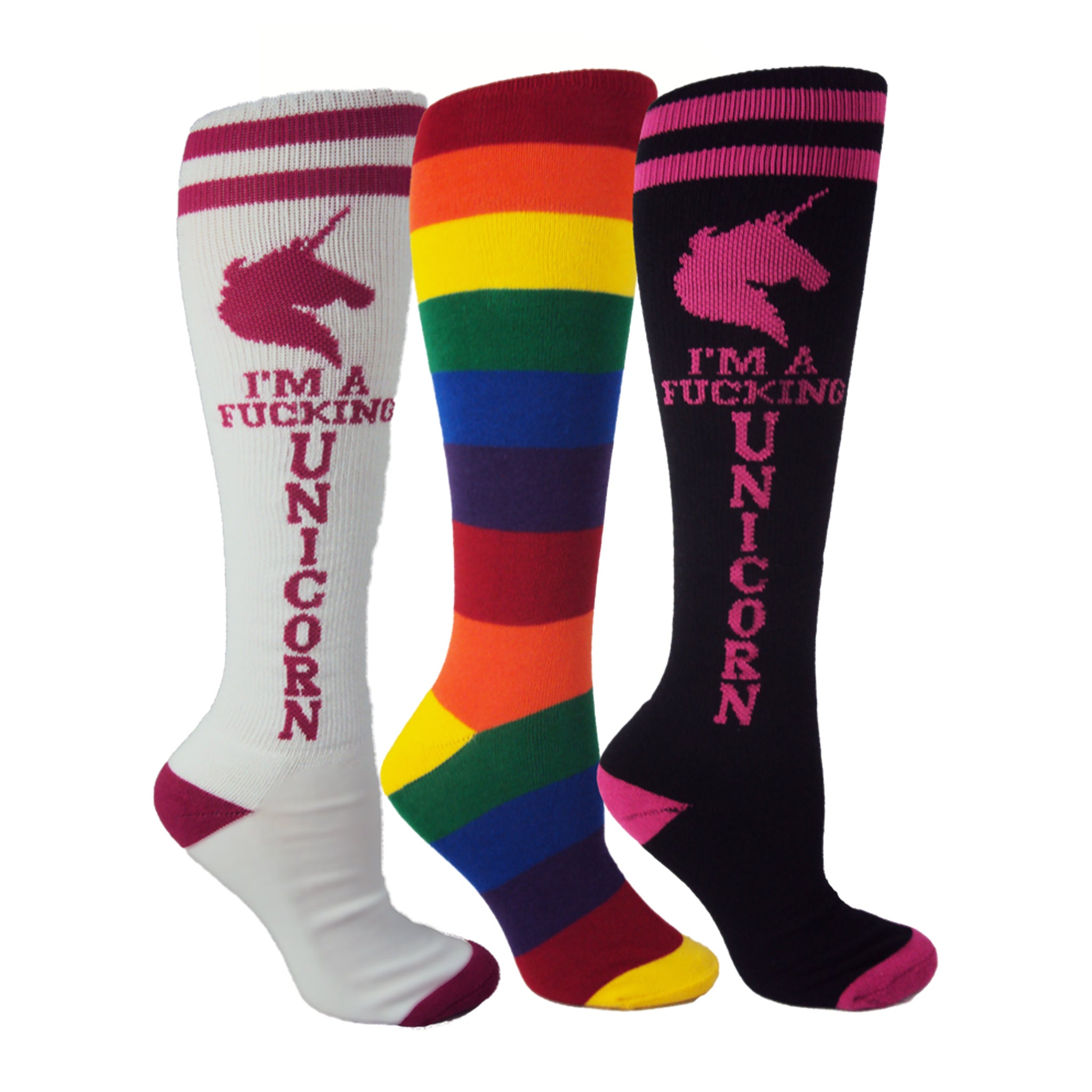 I’M A FUCKING UNICORN!! Show all your sunshine, rainbows, fairy dust, magic sparkles, and your special unique Unicorn horn in these pink knee-highs!! Your friends family and other mythical creature friends will sure get a kick out of these socks. But, don’t worry, they come magically imbued with all the Moxy performance features so you can sail out into the cosmic universe on a rocket ship made of rainbows! Completed with three socks in one easy-to-order pack, with a Black and White Unicorn, and our Rainbow Knee High Socks. Women’s Adult Size, Black with Pink. Rainbow.